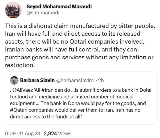 همچنین «محمد مرندی» از افراد نزدیک به تیم مذاکرهکننده ایران نیز در توییتی در پاسخ به ادعاهای «باربارا اسلاوین» تحلیلگر آمریکایی که چنین ادعایی را تکرار کرده بود، نوشت : این ادعایی نادرست است که توسط افراد ناخرسند ساخته شده است. ایران به داراییهای آزاد شده خود دسترسی مستقیم و کامل خواهد داشت؛ شرکتهای قطری نقشی نخواهند داشت، بانکهای ایران کنترل کامل خواهند داشت و میتوانند بدون محدودیت کالا و خدمات خریداری کنند.