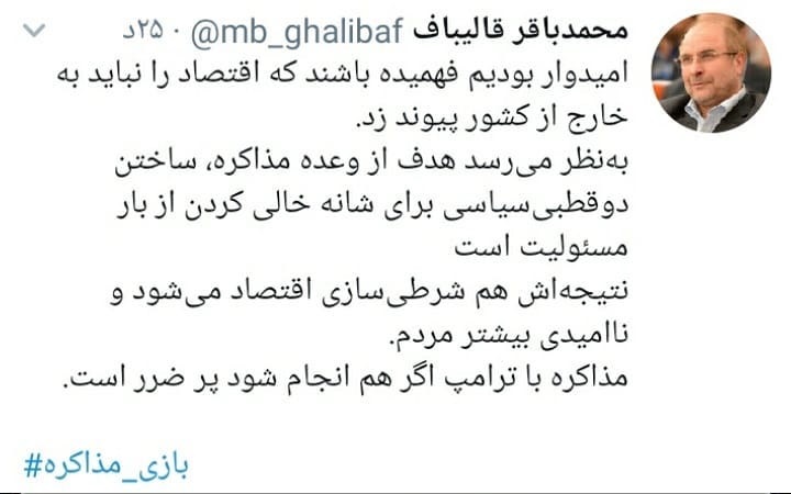 محمدباقر قالیباف با انتشار پستی به گمانه زنیهای اخیر در مورد رابطه ایران و آمریکا و شایعه احتمال مذاکره واکنش نشان داد.